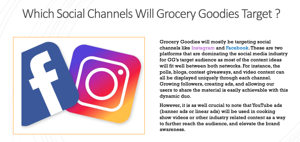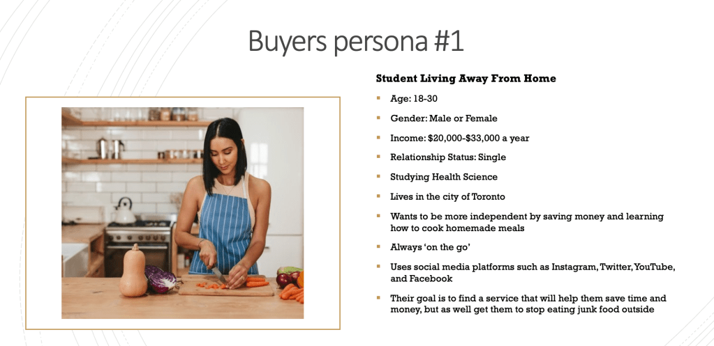 One of my favourite instructors granted us the opportunity to create and design our very own company and marketing strategy. We were responsible for developing the name, description, goals, content calendar, buyer’s persona’s & over 16 content ideas including blogs, quizzes, influencer marketing, giveaways, customer appreciation posts, theme posts, and so much more. This assignment allowed me to explore my passion for food and evaluate how I would stand out from industry competitors through content and social strategy movements.